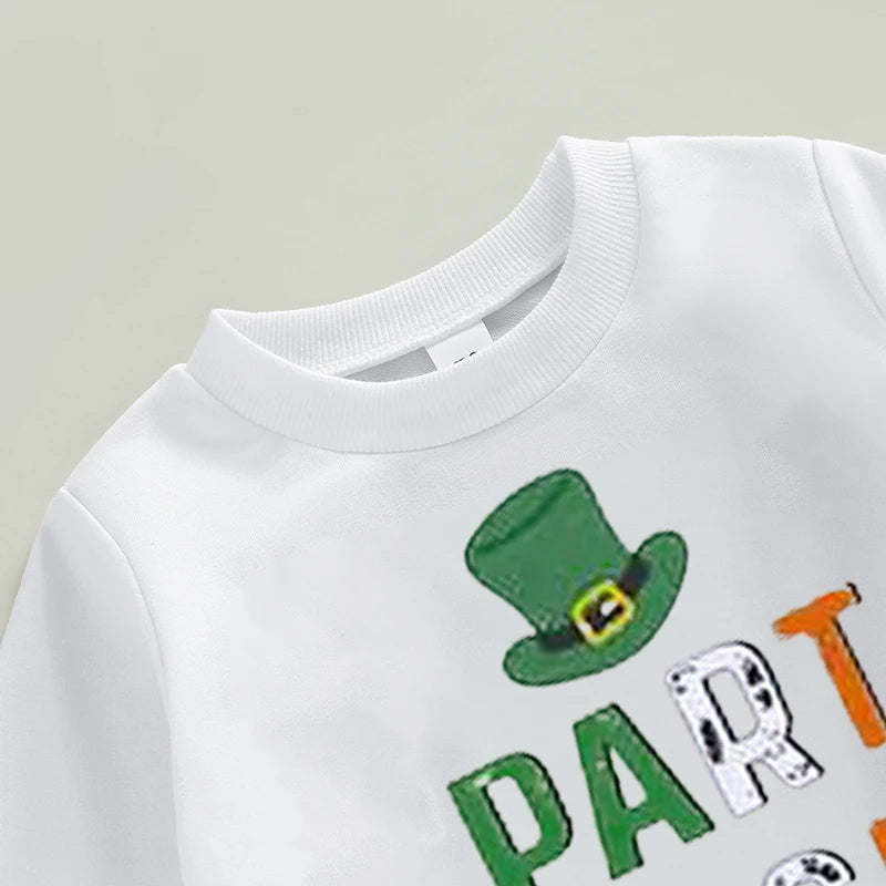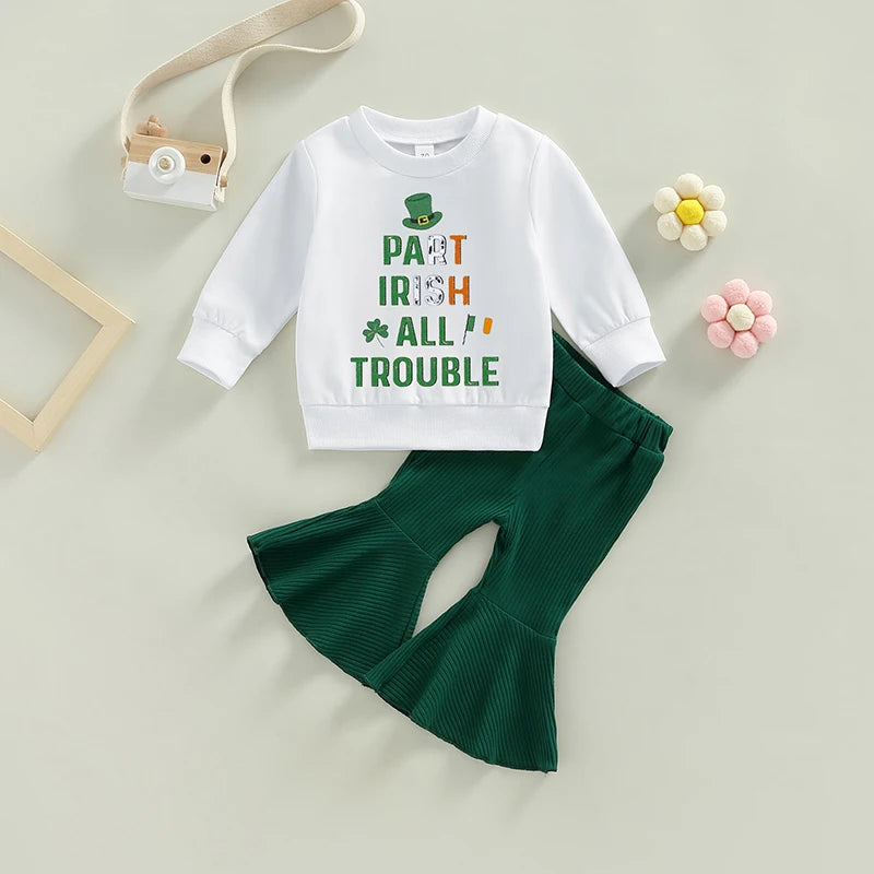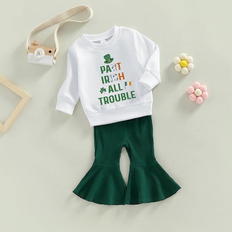 Dress your little girl in festive style with our Toddler Girls Irish Day Outfits. This charming ensemble features letter print long sleeve tops paired with elastic flare pants, perfect for celebrating the holiday with flair.