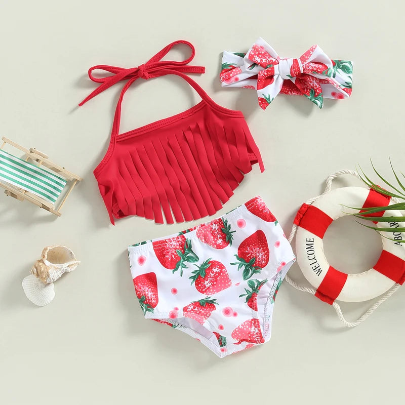 Toddler Girls Swimsuits with Tassel Tops and Strawberry/Flower Print Shorts, Headband Split Bathing Suit