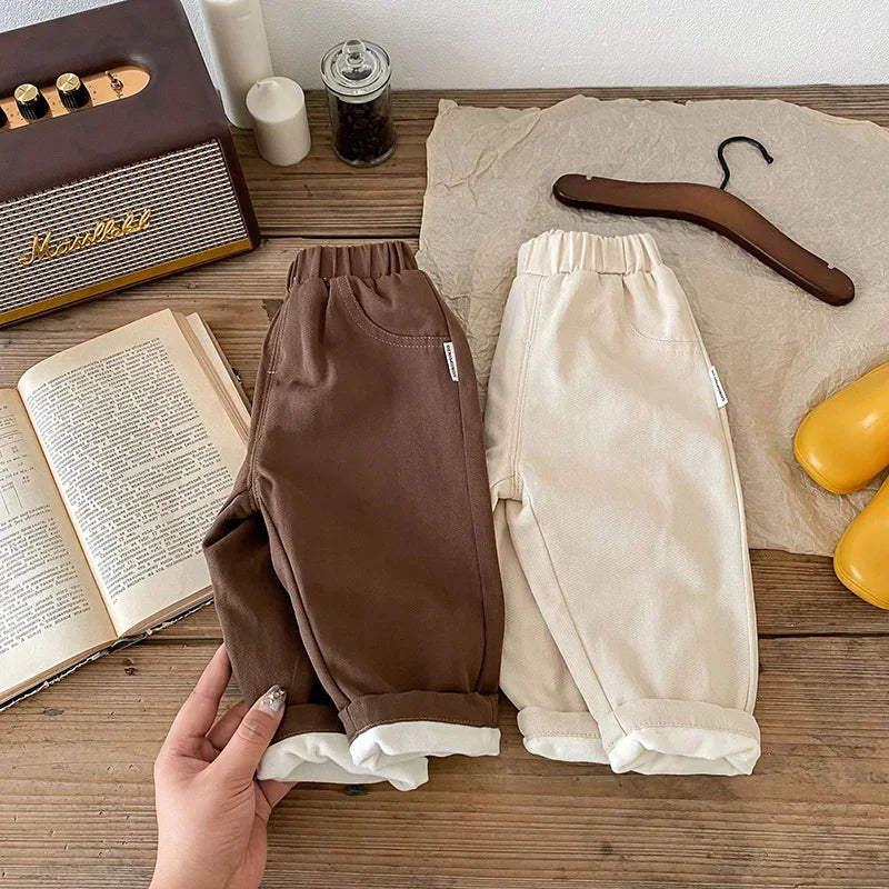 Winter Solid Casual Baby Pants - Girls' Fur-Lined Trousers, Boys' Warm Plush Straight Pants
